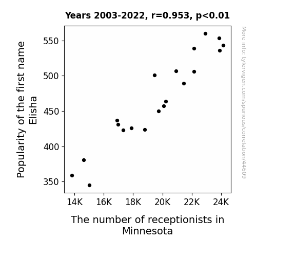 This means 90.8% of the change in the one variable (i.e., The number of receptionists in Minnesota) is predictable based on the change in the other (i.e., Popularity of the first name Elisha) over the 20 years from 2003 through 2022.