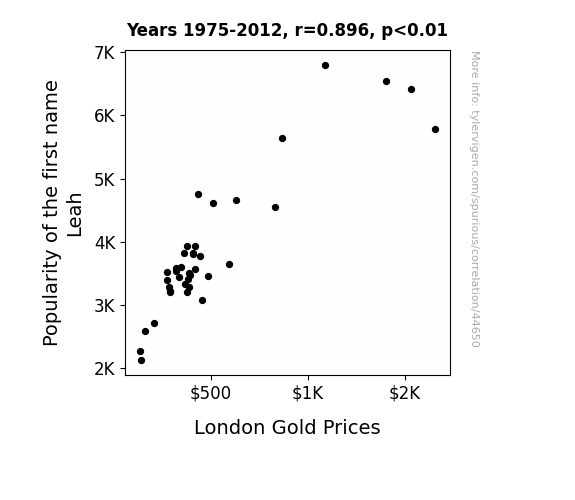 This means 80.3% of the change in the one variable (i.e., London Gold Prices) is predictable based on the change in the other (i.e., Popularity of the first name Leah) over the 38 years from 1975 through 2012.