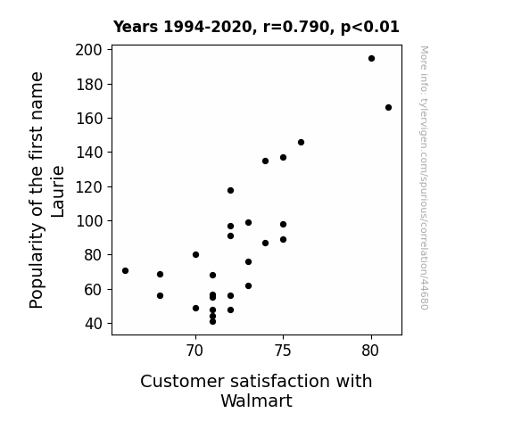 This means 62.3% of the change in the one variable (i.e., Customer satisfaction with Walmart) is predictable based on the change in the other (i.e., Popularity of the first name Laurie) over the 27 years from 1994 through 2020.