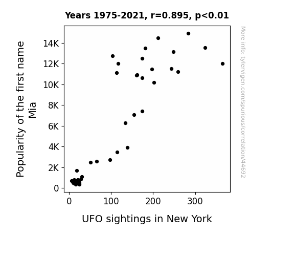 This means 80.1% of the change in the one variable (i.e., UFO sightings in New York) is predictable based on the change in the other (i.e., Popularity of the first name Mia) over the 47 years from 1975 through 2021.