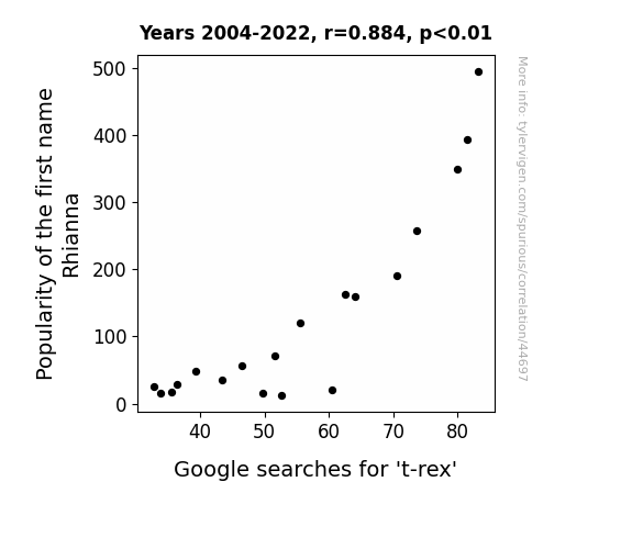 This means 78.2% of the change in the one variable (i.e., Google searches for 't-rex') is predictable based on the change in the other (i.e., Popularity of the first name Rhianna) over the 19 years from 2004 through 2022.