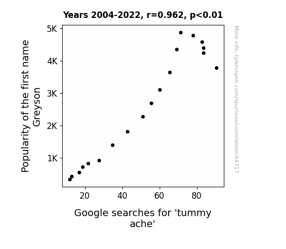This means 92.5% of the change in the one variable (i.e., Google searches for 'tummy ache') is predictable based on the change in the other (i.e., Popularity of the first name Greyson) over the 19 years from 2004 through 2022.