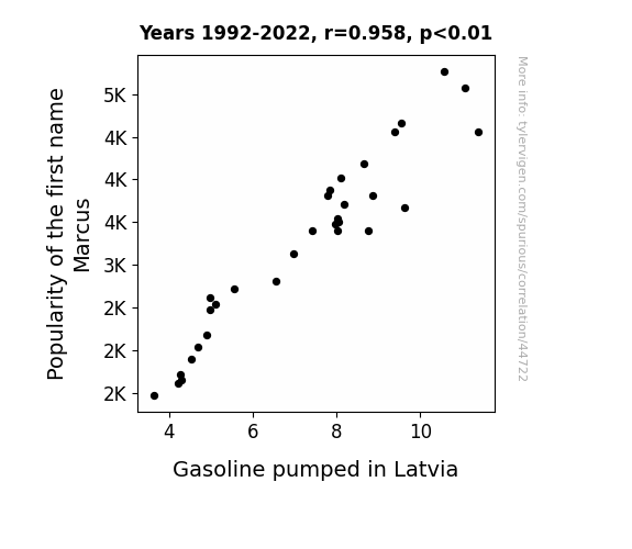 This means 91.8% of the change in the one variable (i.e., Gasoline pumped in Latvia) is predictable based on the change in the other (i.e., Popularity of the first name Marcus) over the 31 years from 1992 through 2022.