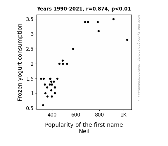 This means 76.4% of the change in the one variable (i.e., Popularity of the first name Neil) is predictable based on the change in the other (i.e., Frozen yogurt consumption) over the 32 years from 1990 through 2021.