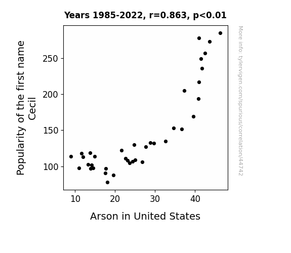 This means 74.4% of the change in the one variable (i.e., Arson in United States) is predictable based on the change in the other (i.e., Popularity of the first name Cecil) over the 38 years from 1985 through 2022.