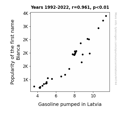 This means 92.4% of the change in the one variable (i.e., Gasoline pumped in Latvia) is predictable based on the change in the other (i.e., Popularity of the first name Bianca) over the 31 years from 1992 through 2022.