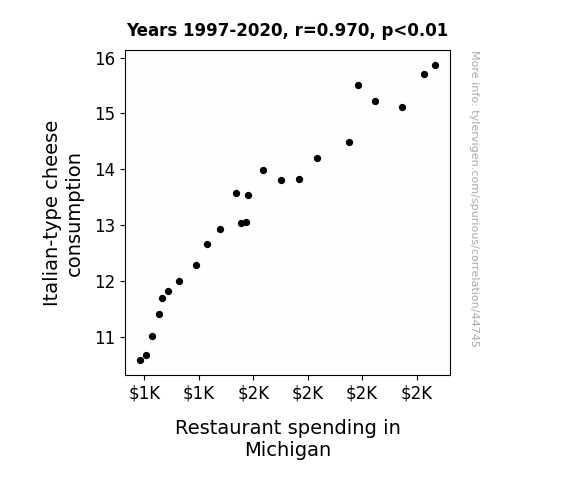 This means 94% of the change in the one variable (i.e., Restaurant spending in Michigan) is predictable based on the change in the other (i.e., Italian-type cheese consumption) over the 24 years from 1997 through 2020.
