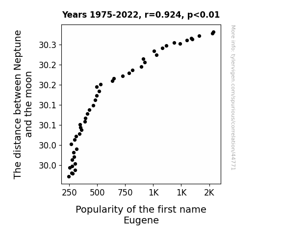 This means 85.3% of the change in the one variable (i.e., Popularity of the first name Eugene) is predictable based on the change in the other (i.e., The distance between Neptune and the moon) over the 48 years from 1975 through 2022.