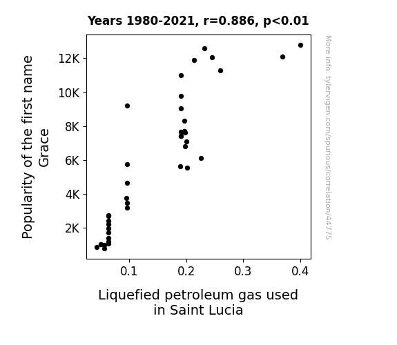 This means 78.5% of the change in the one variable (i.e., Liquefied petroleum gas used in Saint Lucia) is predictable based on the change in the other (i.e., Popularity of the first name Grace) over the 42 years from 1980 through 2021.