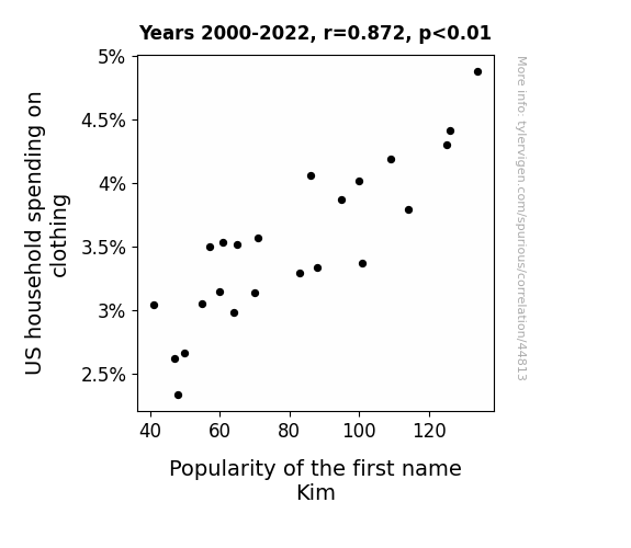 This means 76% of the change in the one variable (i.e., Popularity of the first name Kim) is predictable based on the change in the other (i.e., US household spending on clothing) over the 23 years from 2000 through 2022.
