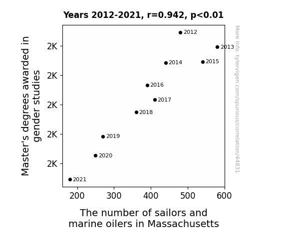 This means 88.8% of the change in the one variable (i.e., The number of sailors and marine oilers in Massachusetts) is predictable based on the change in the other (i.e., Master's degrees awarded in gender studies) over the 10 years from 2012 through 2021.