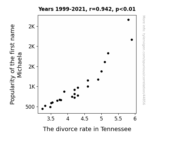 This means 88.8% of the change in the one variable (i.e., The divorce rate in Tennessee) is predictable based on the change in the other (i.e., Popularity of the first name Michaela) over the 23 years from 1999 through 2021.