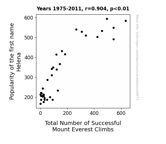 This means 81.7% of the change in the one variable (i.e., Total Number of Successful Mount Everest Climbs) is predictable based on the change in the other (i.e., Popularity of the first name Helena) over the 37 years from 1975 through 2011.