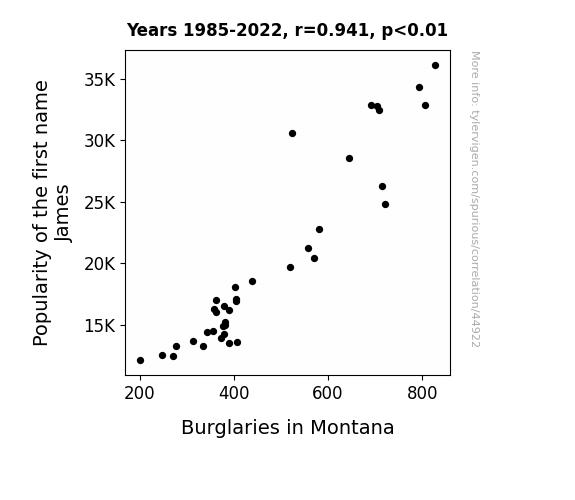This means 88.5% of the change in the one variable (i.e., Burglaries in Montana) is predictable based on the change in the other (i.e., Popularity of the first name James) over the 38 years from 1985 through 2022.