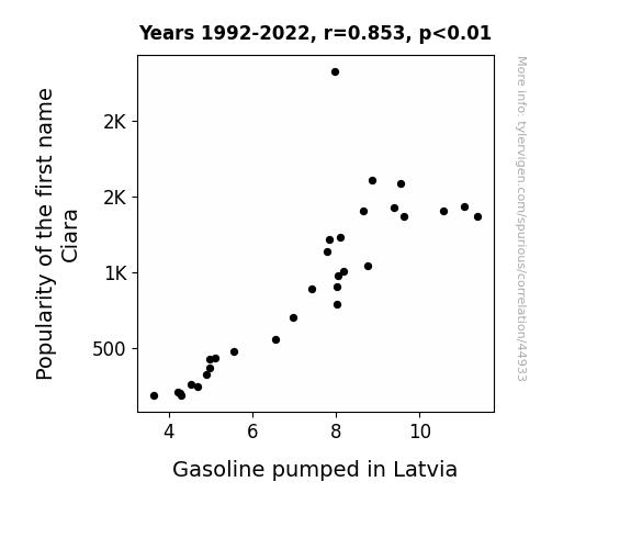 This means 72.8% of the change in the one variable (i.e., Gasoline pumped in Latvia) is predictable based on the change in the other (i.e., Popularity of the first name Ciara) over the 31 years from 1992 through 2022.