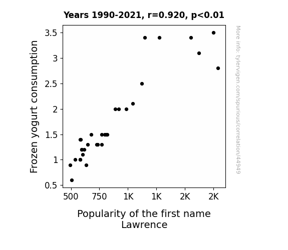 This means 84.6% of the change in the one variable (i.e., Popularity of the first name Lawrence) is predictable based on the change in the other (i.e., Frozen yogurt consumption) over the 32 years from 1990 through 2021.