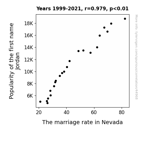 This means 95.8% of the change in the one variable (i.e., The marriage rate in Nevada) is predictable based on the change in the other (i.e., Popularity of the first name Jordan) over the 23 years from 1999 through 2021.