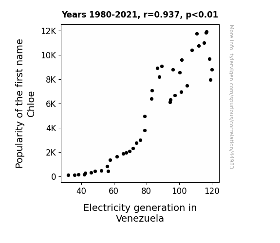 This means 87.9% of the change in the one variable (i.e., Electricity generation in Venezuela) is predictable based on the change in the other (i.e., Popularity of the first name Chloe) over the 42 years from 1980 through 2021.