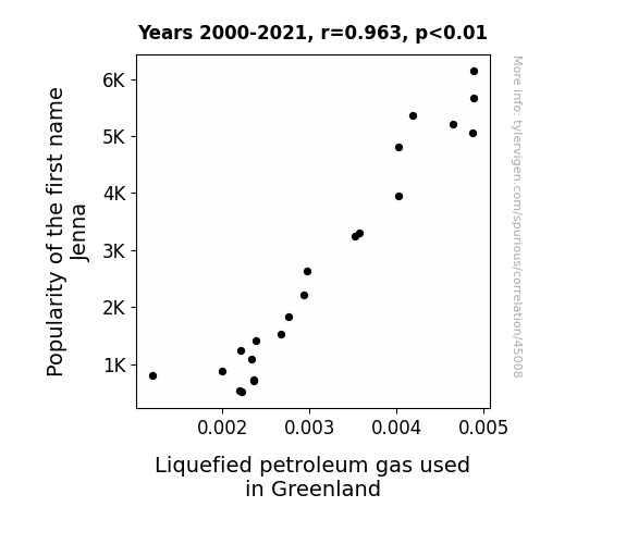 This means 92.8% of the change in the one variable (i.e., Liquefied petroleum gas used in Greenland) is predictable based on the change in the other (i.e., Popularity of the first name Jenna) over the 22 years from 2000 through 2021.