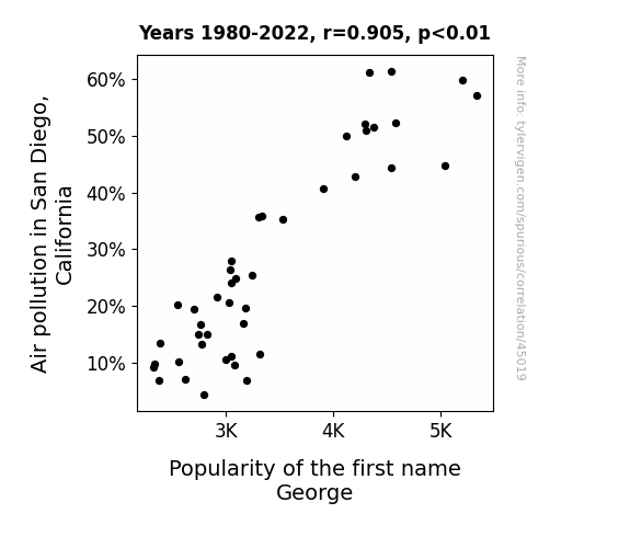 This means 81.9% of the change in the one variable (i.e., Popularity of the first name George) is predictable based on the change in the other (i.e., Air pollution in San Diego, California) over the 43 years from 1980 through 2022.