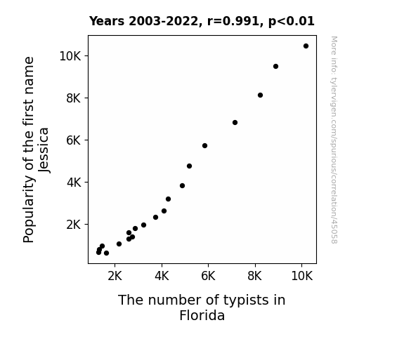 This means 98.2% of the change in the one variable (i.e., The number of typists in Florida) is predictable based on the change in the other (i.e., Popularity of the first name Jessica) over the 20 years from 2003 through 2022.