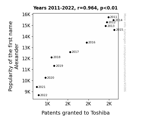 This means 93% of the change in the one variable (i.e., Patents granted to Toshiba) is predictable based on the change in the other (i.e., Popularity of the first name Alexander) over the 12 years from 2011 through 2022.