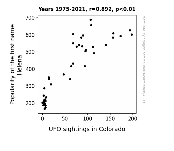 This means 79.5% of the change in the one variable (i.e., UFO sightings in Colorado) is predictable based on the change in the other (i.e., Popularity of the first name Helena) over the 47 years from 1975 through 2021.
