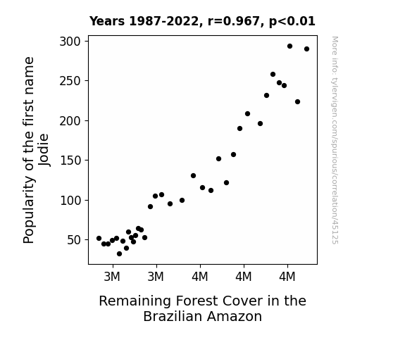 This means 93.4% of the change in the one variable (i.e., Remaining Forest Cover in the Brazilian Amazon) is predictable based on the change in the other (i.e., Popularity of the first name Jodie) over the 36 years from 1987 through 2022.
