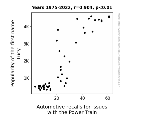 This means 81.7% of the change in the one variable (i.e., Automotive recalls for issues with the Power Train) is predictable based on the change in the other (i.e., Popularity of the first name Lucy) over the 48 years from 1975 through 2022.