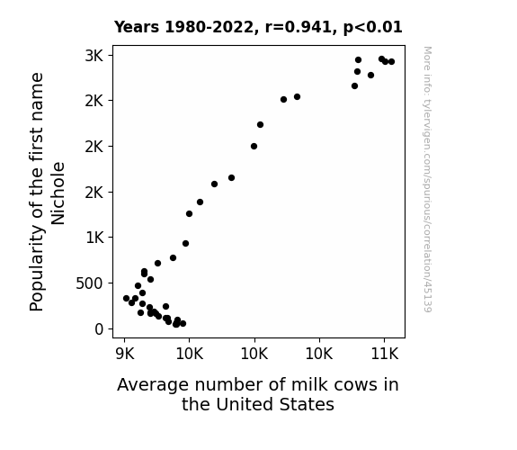 This means 88.6% of the change in the one variable (i.e., Average number of milk cows in the United States) is predictable based on the change in the other (i.e., Popularity of the first name Nichole) over the 43 years from 1980 through 2022.