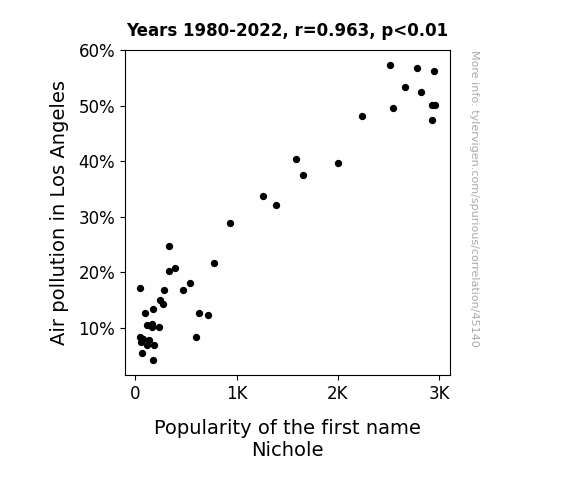 This means 92.8% of the change in the one variable (i.e., Popularity of the first name Nichole) is predictable based on the change in the other (i.e., Air pollution in Los Angeles) over the 43 years from 1980 through 2022.