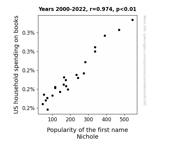 This means 94.9% of the change in the one variable (i.e., Popularity of the first name Nichole) is predictable based on the change in the other (i.e., US household spending on books) over the 23 years from 2000 through 2022.
