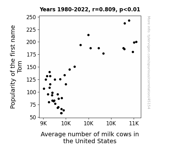 This means 65.4% of the change in the one variable (i.e., Average number of milk cows in the United States) is predictable based on the change in the other (i.e., Popularity of the first name Tom) over the 43 years from 1980 through 2022.