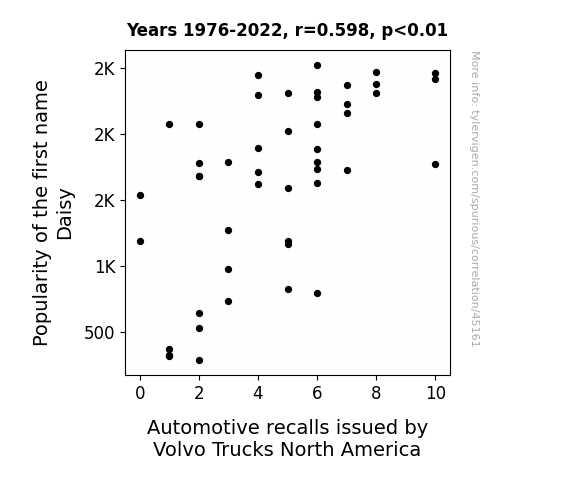 This means 35.7% of the change in the one variable (i.e., Automotive recalls issued by Volvo Trucks North America) is predictable based on the change in the other (i.e., Popularity of the first name Daisy) over the 47 years from 1976 through 2022.