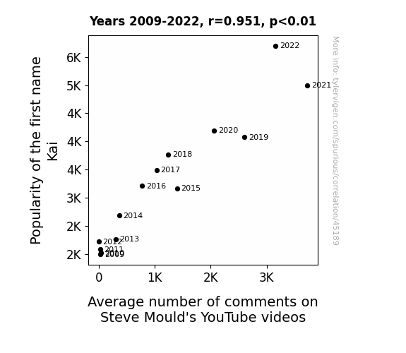 This means 90.5% of the change in the one variable (i.e., Average number of comments on Steve Mould's YouTube videos) is predictable based on the change in the other (i.e., Popularity of the first name Kai) over the 14 years from 2009 through 2022.