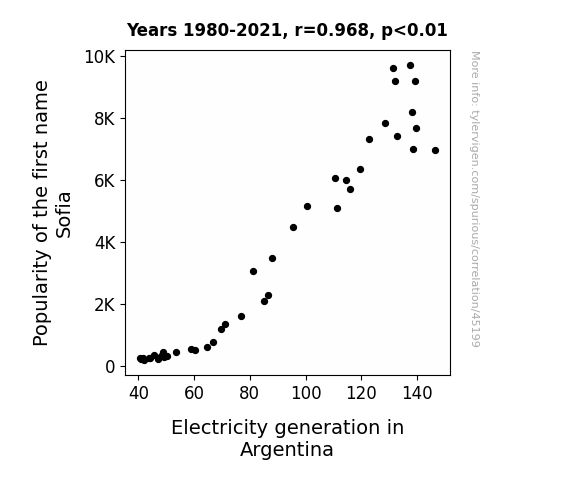 This means 93.8% of the change in the one variable (i.e., Electricity generation in Argentina) is predictable based on the change in the other (i.e., Popularity of the first name Sofia) over the 42 years from 1980 through 2021.