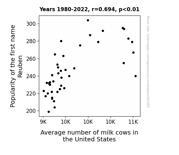 This means 48.2% of the change in the one variable (i.e., Average number of milk cows in the United States) is predictable based on the change in the other (i.e., Popularity of the first name Reuben) over the 43 years from 1980 through 2022.