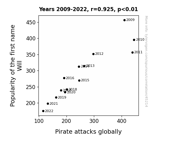 This means 85.6% of the change in the one variable (i.e., Pirate attacks globally) is predictable based on the change in the other (i.e., Popularity of the first name Will) over the 14 years from 2009 through 2022.