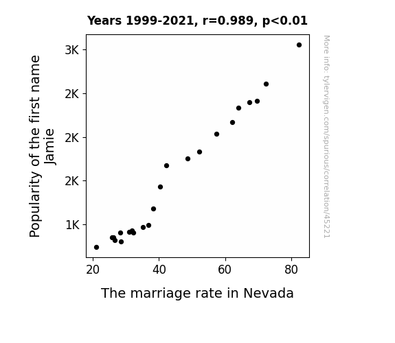 This means 97.8% of the change in the one variable (i.e., The marriage rate in Nevada) is predictable based on the change in the other (i.e., Popularity of the first name Jamie) over the 23 years from 1999 through 2021.