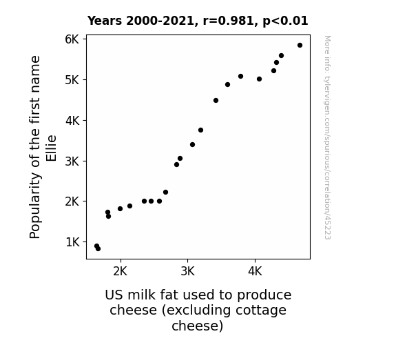 This means 96.3% of the change in the one variable (i.e., US milk fat used to produce cheese (excluding cottage cheese)) is predictable based on the change in the other (i.e., Popularity of the first name Ellie) over the 22 years from 2000 through 2021.