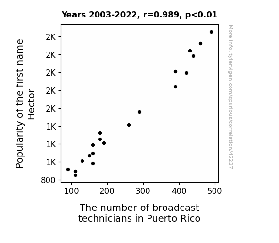 This means 97.8% of the change in the one variable (i.e., The number of broadcast technicians in Puerto Rico) is predictable based on the change in the other (i.e., Popularity of the first name Hector) over the 20 years from 2003 through 2022.