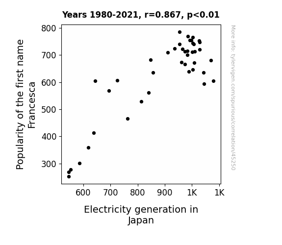This means 75.1% of the change in the one variable (i.e., Electricity generation in Japan) is predictable based on the change in the other (i.e., Popularity of the first name Francesca) over the 42 years from 1980 through 2021.