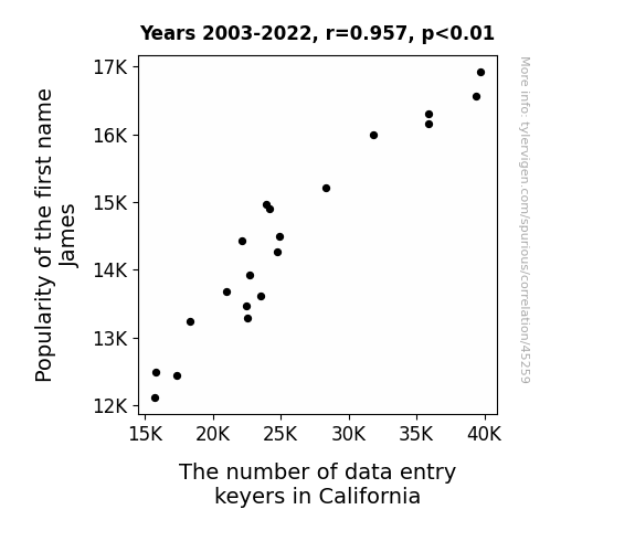 This means 91.5% of the change in the one variable (i.e., The number of data entry keyers in California) is predictable based on the change in the other (i.e., Popularity of the first name James) over the 20 years from 2003 through 2022.