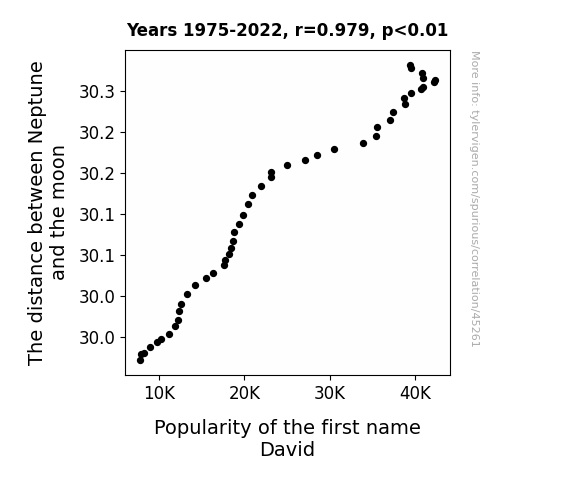 This means 95.9% of the change in the one variable (i.e., Popularity of the first name David) is predictable based on the change in the other (i.e., The distance between Neptune and the moon) over the 48 years from 1975 through 2022.