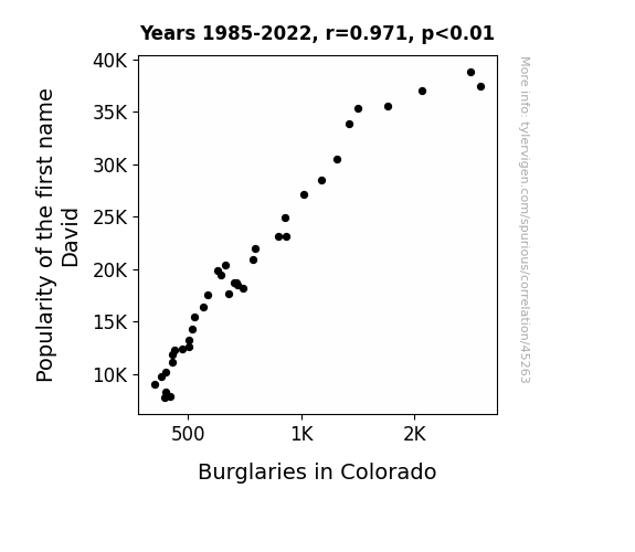 This means 94.4% of the change in the one variable (i.e., Burglaries in Colorado) is predictable based on the change in the other (i.e., Popularity of the first name David) over the 38 years from 1985 through 2022.