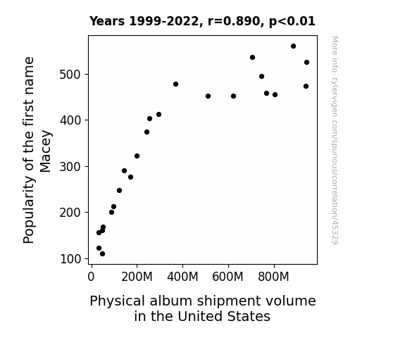 This means 79.3% of the change in the one variable (i.e., Physical album shipment volume in the United States) is predictable based on the change in the other (i.e., Popularity of the first name Macey) over the 24 years from 1999 through 2022.
