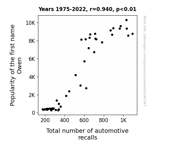 This means 88.3% of the change in the one variable (i.e., Total number of automotive recalls) is predictable based on the change in the other (i.e., Popularity of the first name Owen) over the 48 years from 1975 through 2022.