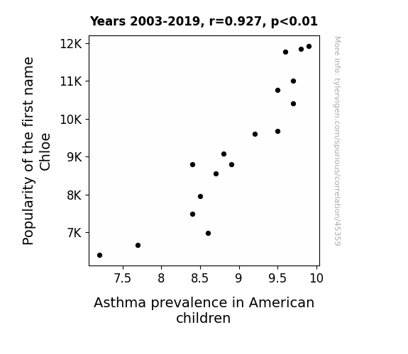 This means 85.9% of the change in the one variable (i.e., Asthma prevalence in American children) is predictable based on the change in the other (i.e., Popularity of the first name Chloe) over the 17 years from 2003 through 2019.