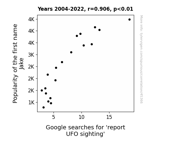 This means 82.1% of the change in the one variable (i.e., Google searches for 'report UFO sighting') is predictable based on the change in the other (i.e., Popularity of the first name Jake) over the 19 years from 2004 through 2022.