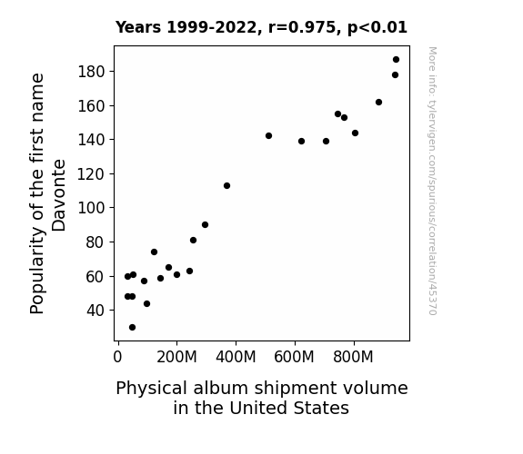 This means 95% of the change in the one variable (i.e., Physical album shipment volume in the United States) is predictable based on the change in the other (i.e., Popularity of the first name Davonte) over the 24 years from 1999 through 2022.